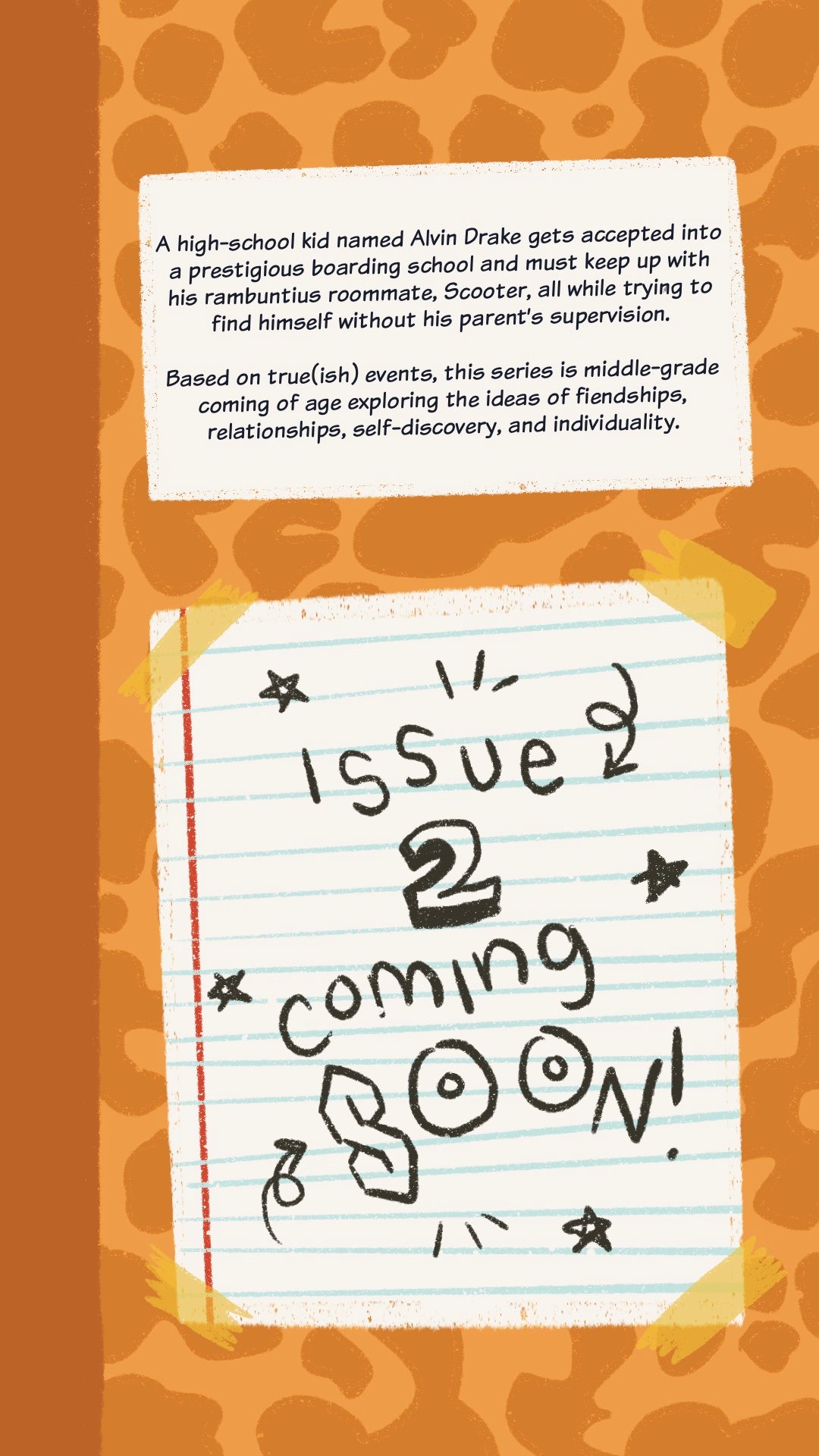 A high school kid named Alvin Drake gets accepted into a prestigious boarding school and must keep up with his rambunctious roommate, Scooter, all while trying to find himself, without his parents' supervision. Based on true events, this series is a middle-grade coming of age exploring the ideas of friendship, relationships, self-discovery, and individuality. Below is the first issue and other illustrations.