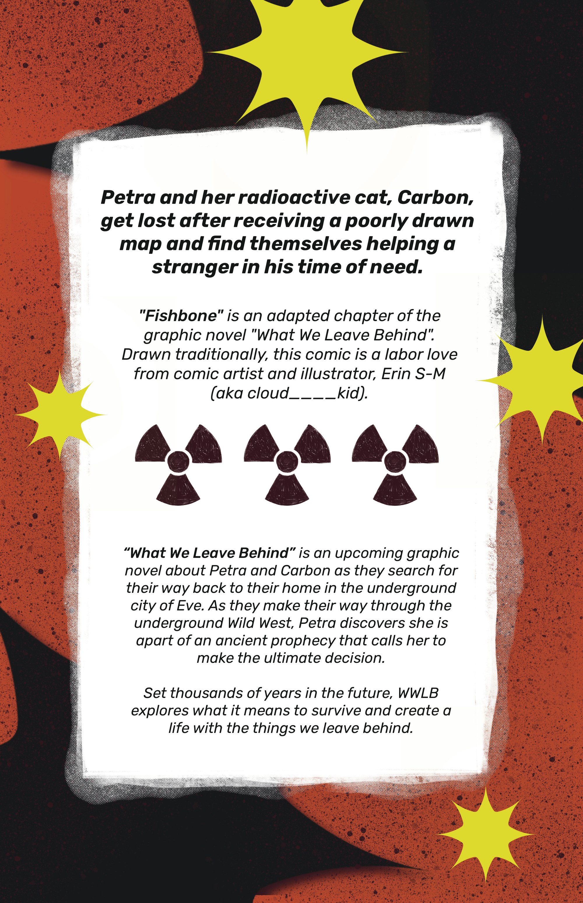 Petra and her radioactive cat, Carbon, get lost after receiving a poorly drawn map and find themselves helping a stranger in his time of need. "Fishbone" is an adapted chapter of the graphic novel "What We Leave Behind". Drawn traditionally, this comic is a labor love from comic artist and illustrator, Erin S-M (aka cloud____kid).